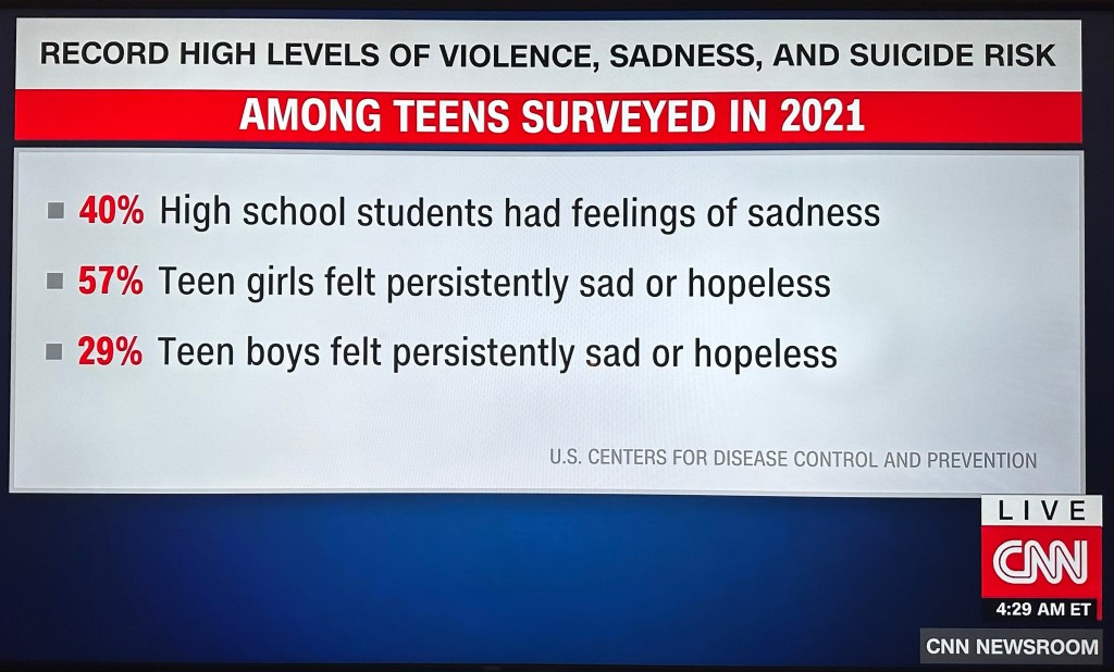 Understand, the above sources are a mere snapshot of reporting from three national cable news outlets, and yes I am well aware each source brings with it their own distinct bias. Yet, even with their respective leans, the conscious decision to report on the social and emotional concerns of teens suggests a unified effort to convey the severity of this stark reality.